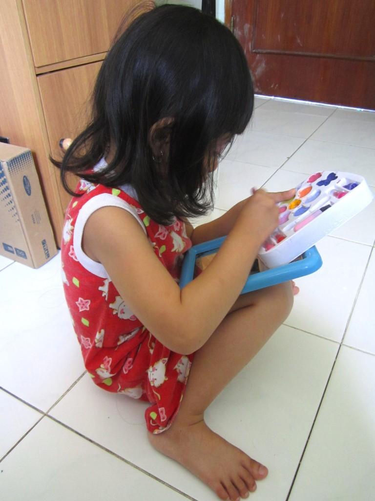 Alicia, my second born. Different she is. Not as easy as her sister nor her brother. Her mood changing in seconds, like she has a switch or something. I never thought she's naughty, though. I just say that she is....Bright! Oh yes, like the Sun, Alicia's personality is warm and bright and POP. She loves to running around, jumping on Mommy's bed, climbing on everything climb-able, doodling on....almost everything, teasing annoying her sister (roots of the epic fights, and I'll start yelling), playing wrestled with Agasha (and I'll start yelled again), hm....what else did i missed...?
